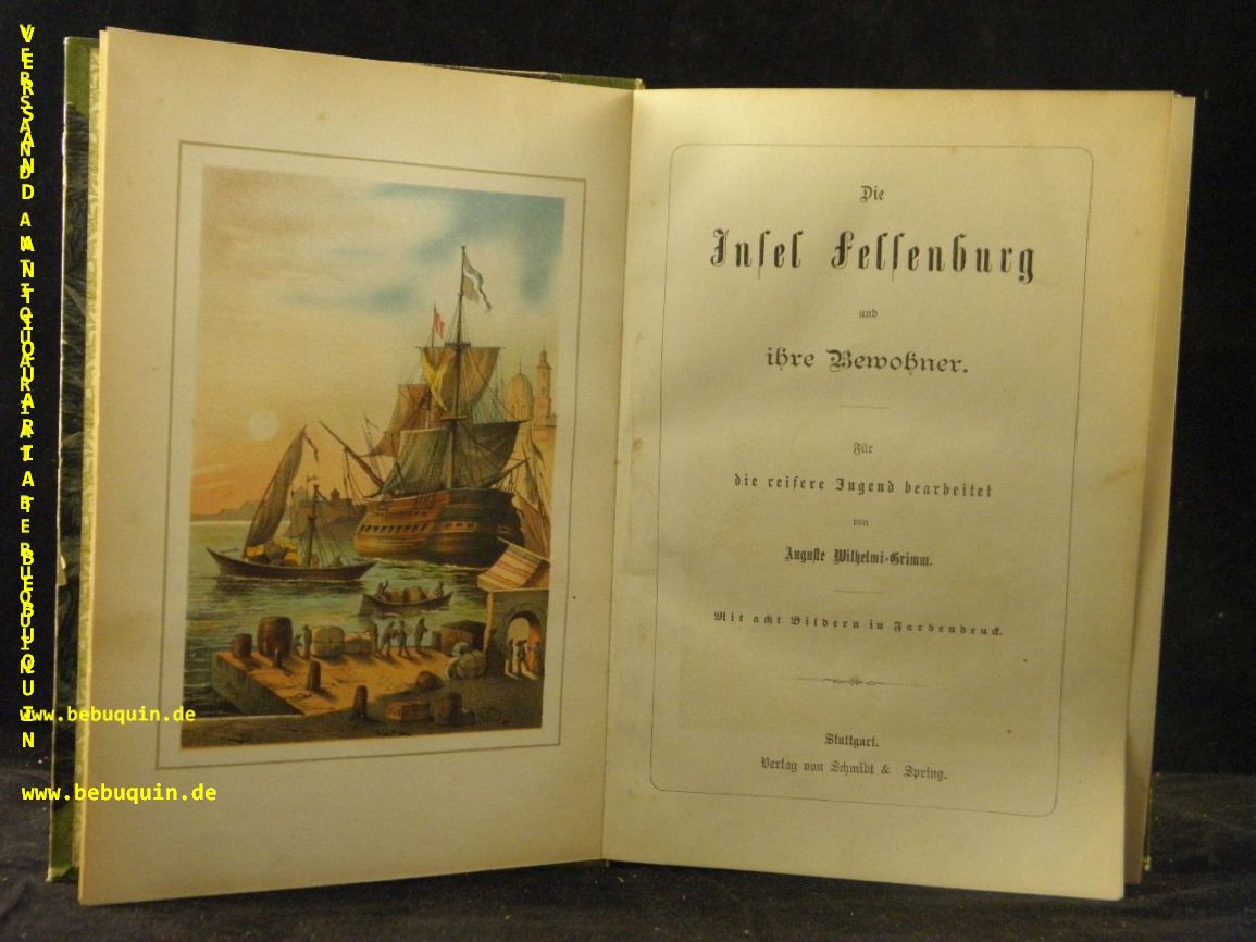 SCHNABEL.– WILHELMI-GRIMM, Auguste: Die Insel Felsenburg und ihre Bewohner. Für die reifere Jugend bearb. Stuttgart (Schmidt & Spring), (1876). Gr. 8°. 2 Bl., 297 S. mit 8 Bildern in Farbendruck. HLn der Zeit. schönes Ex. EA dieser freie Bearbeitung der erstmals 1731 – 1743 erschienenen Robinsoande von Johann Gottfried Schnabel. Klotz 8291/1; Wegehaupt 3671.