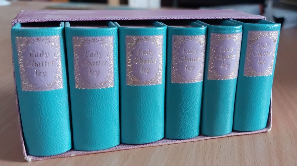 LAWRENCE, D. H.: Lady Chatterley. 6 Bände. Leipzig (Andersen Nexö), 1977. 6 x 6 cm. ca. 2000 S. auf rosanem Papier gedruckt mit Illustrationen von Siegfried Hempel. grünes OLdr. in OSchuber