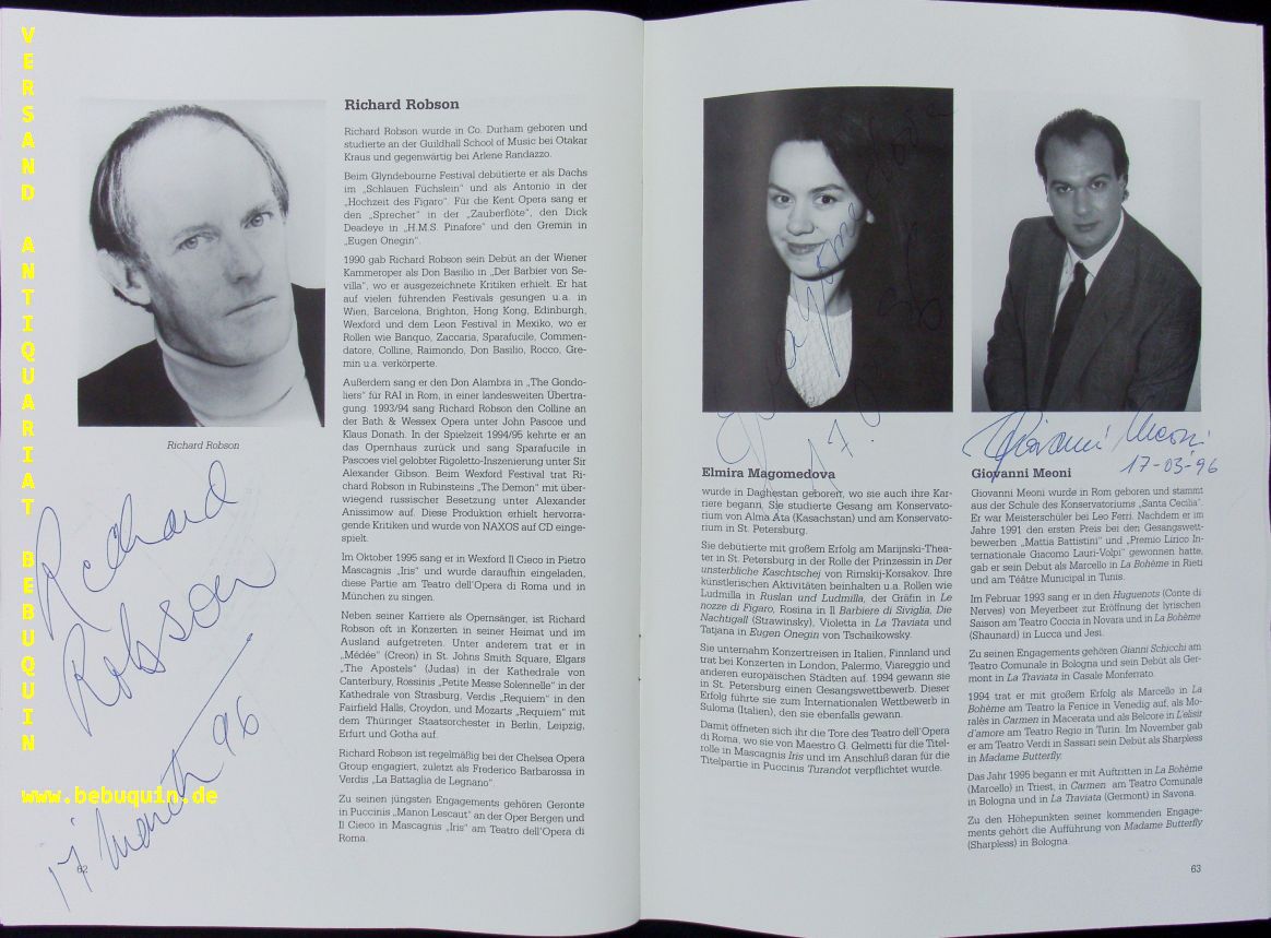 GELMETTI, Gianluigi (Dirigent) + ROBSON, Richard + MAGOMEDOVA, Elmira + GLASSMANN, Allan + MEONI, Giovanni + BARBIERI, Christina + CESARE, Ezio di: Programmheft der Konzertanten Aufführung von „Iris“ mit den eigenhändigen Signaturen der Solisten an den entsprechenden Fotos. Münchner Philharmoniker. München (Philharmonie), 17.3.1996. 4°. 68 S. mit zahlr. teils ganzseitigen farbigen Abb. farb. ill. OKart. mit 2 inliegenden Eintrittskarten. gutes Ex. Gianluigi Gelmetti (* 11. September 1945 in Rom) ist ein italienischer Dirigent und Komponist.