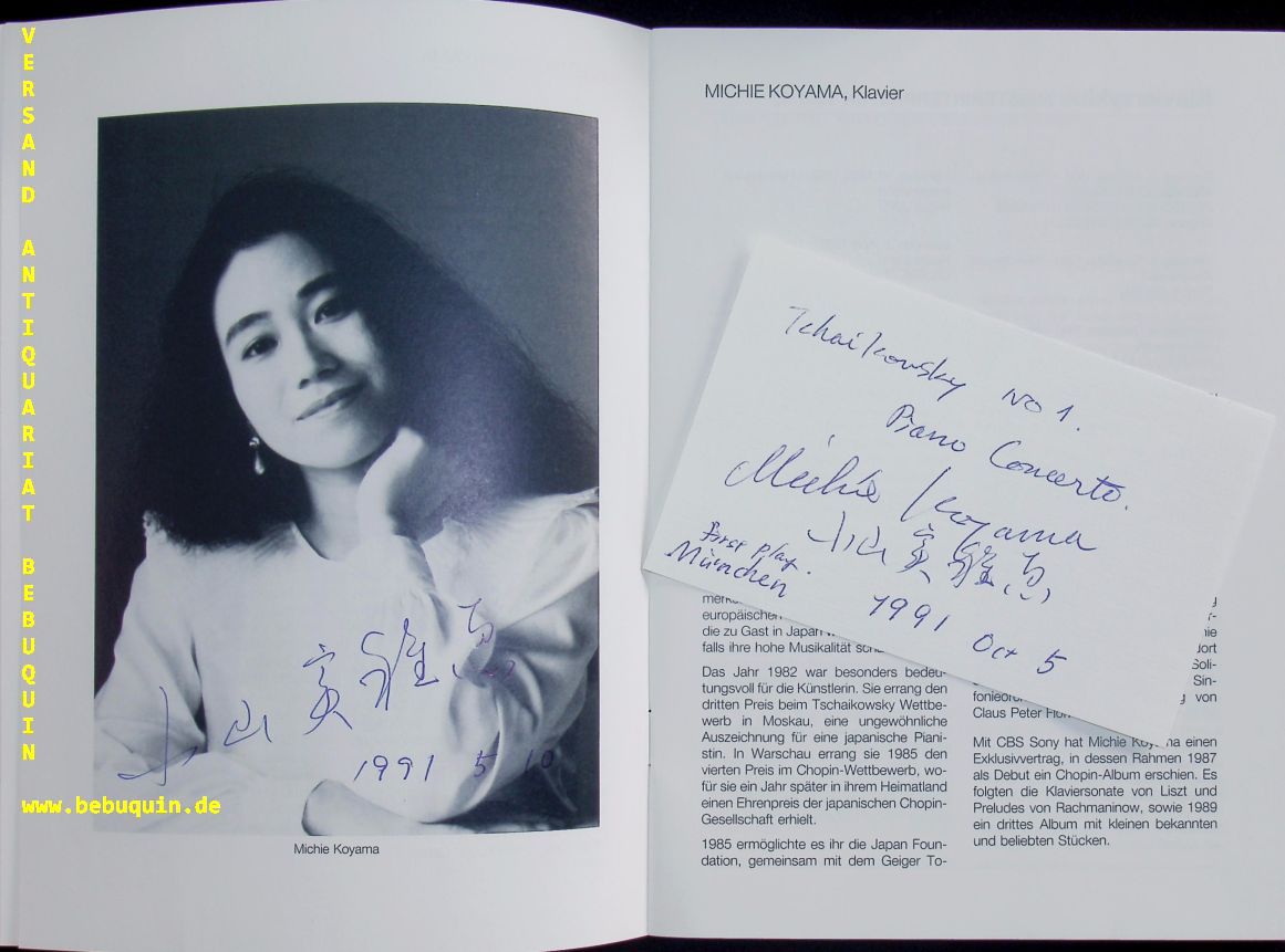 AKIYAMA, Kazuyoshi (Dirigent) + KOYAMA, Michie (Pianistin): Programmheft mit den beiden eigenhändigen Signaturen am Portraitfoto. Mit dem Tokyo Symphony Orchestra. München (Philharmonie), 5.10.1991. 16 S. mit zahl. Abb. OKart. dabei 2 eigenhändig signierte und datierte Karteikarten der beiden Musiker. tadellos = Münchner Konzertdirektion Hörtnagel. Kazuyoshi Akiyama (* 2. Januar 1941 in Tokio) ist ein japanischer Dirigent.