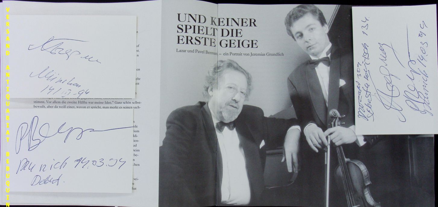 BERMANN, Lazar (Pianist) + Pavel (Violinist): 3 eigenhändig signierte und datierte Autogrammkarten (einzeln und zusammen). München (Herkulessaal), 21.3.1994. 8 x 12,5 cm. 3 Karteikarten in Programmheft. Eintrittskarte anbei. 12 S. mit zahlr. Abb. OKart. leicht gewellt. = Winderstein Konzerte. Lasar Naumowitsch Berman (* 26. Februar 1930 in Leningrad; † 6. Februar 2005 in Florenz) war ein russischer Pianist. Pavel ist sein Sohn. (Wikipedia)