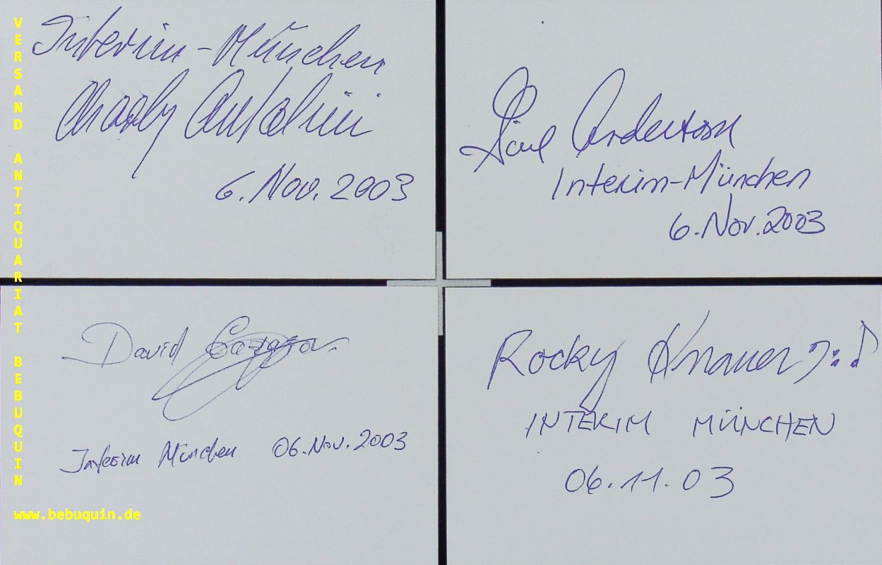 JAZZ.– ANTOLINI, Charly (Schlagzeuger) + GAZAROV, David (Pianist) + KNAUER, Rocky (Bassist) + HOOKS, Steve: 5 eigenhändig signierte und datierte Autogrammkarten. München (Interim), 6.11.2003. 8 x 12,5 cm. 5 Karteikarten mit Beiblättern. Charly Antolini (* 24. Mai 1937 in Zürich) ist ein Schweizer Jazz-Schlagzeuger, der mit Dixieland und Swing begann und sich in den 1960er und 70er Jahren an Hard Bop und Fusion (Jazz Rock) orientierte. Er gilt als einer der handwerklich-technisch besten Schlagzeuger Europas. David Gazarov (* 19. Mai 1965 in Baku) ist ein deutscher, in München lebender Jazzpianist armenischen Ursprungs. Joachim „Rocky“ Knauer (* 6. Januar 1951 in Hanerau-Hademarschen) ist ein deutscher Bassist des Modern Jazz. Steve Hooks, eigentlich Stephen George Hooks (* 25. März 1946 in Ottumwa, Iowa; † 14. März 2019 in München[1]) war ein US-amerikanischer Jazzmusiker und -Komponist, vorwiegend bekannt als Saxophonist. (Wikipedia)