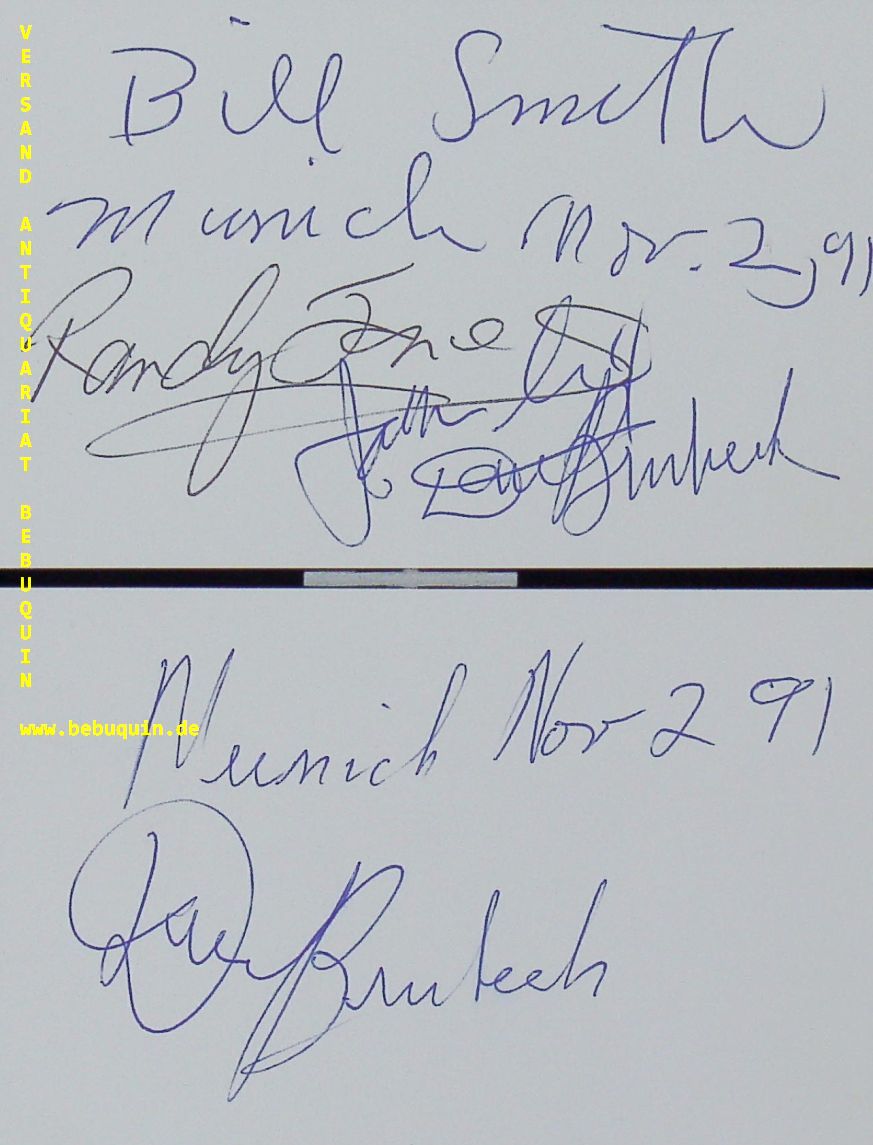 JAZZ.– BRUBECK, Dave (Pianist) + SMITH, Bill (Klarinettist) + SIX, Jack (Bassist) + JONES, Randy (Schlagzeuger): 2 eigenhändig signierte und datierte Autogrammkarte von Brubeck + Quartett. München (Philharmonie), 2.11.1991. 8 x 12,5 cm. 2 Karteikarte + Beiblatt. David Warren „Dave“ Brubeck (* 6. Dezember 1920 in Concord, Kalifornien; † 5. Dezember 2012 in Norwalk, Connecticut) war ein US-amerikanischer Jazzpianist, Komponist und Bandleader. Er leitete mit seinem Quartett eine der langlebigsten und erfolgreichsten Combos des Modern Jazz und eroberte dem Jazz mit der intellektuellen Mittelschicht ein neues Publikum. William Overton „Bill“ Smith (* 22. September 1926 in Sacramento; † 29. Februar 2020 in Seattle) war ein US-amerikanischer (Jazz)-Klarinettist und Komponist (vor allem Cool Jazz, Third Stream). Er war einer der ersten Klarinettisten, die Multiphonics auf der Klarinette entwickelten. Jack E. Six (* 26. Juli 1930 in Danville (Illinois)[1]; † Anfang 2015[2]) war ein US-amerikanischer Jazz-Bassist. Randall Hodges Jones (January 23, 1944 – June 13, 2016) was a British-born American jazz drummer. (Wikipedia)
