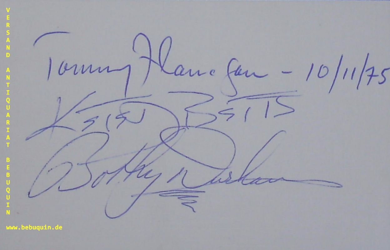 JAZZ.– DURHAM, Bobby (Schlagzeuger) + FLANAGAN, Tommy (Pianist) + BETTS, Keter (Bassist): eigenhändig signierte und datierte Autogrammkarte. München (Kongressaal), 10.11.1975. 8 x 10,5 cm. Karteikarte Keter Betts, eigentlich William Thomas Betts (* 22. Juli 1928 in Port Chester, New York; † 6. August 2005 in Silver Spring, Maryland) war ein amerikanischer Jazz-Bassist. Thomas „Tommy“ Lee Flanagan (* 16. März 1930 in Detroit; † 16. November 2001 in New York City) war ein amerikanischer Jazz-Pianist des Mainstream Jazz. Bobby Durham (* 3. Februar 1937 in Philadelphia, Pennsylvania; † 7. Juli 2008 in Genua, Italien) war ein amerikanischer Jazz-Schlagzeuger. (Wikipedia)