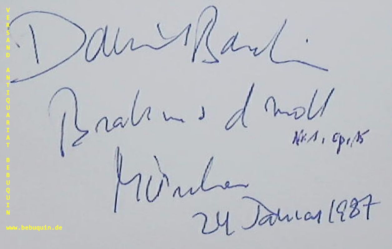 BARENBOIM, Daniel (Dirigent): eigenhändig signierte und datierte Autogrammkarte zu Brahms d moll. München (Philharmonie), 24.1.1987. 8 x 12,5 cm. Karteikarte. Daniel Barenboim (* 15. November 1942 in Buenos Aires, Argentinien) ist ein argentinisch-israelischer Pianist und Dirigent. Er erhielt zahlreiche internationale Ehrungen und Auszeichnungen, einschließlich des deutschen Großen Bundesverdienstkreuzes. Er besitzt die spanische, argentinische, israelische und palästinensische Staatsangehörigkeit. (Wikipedia)