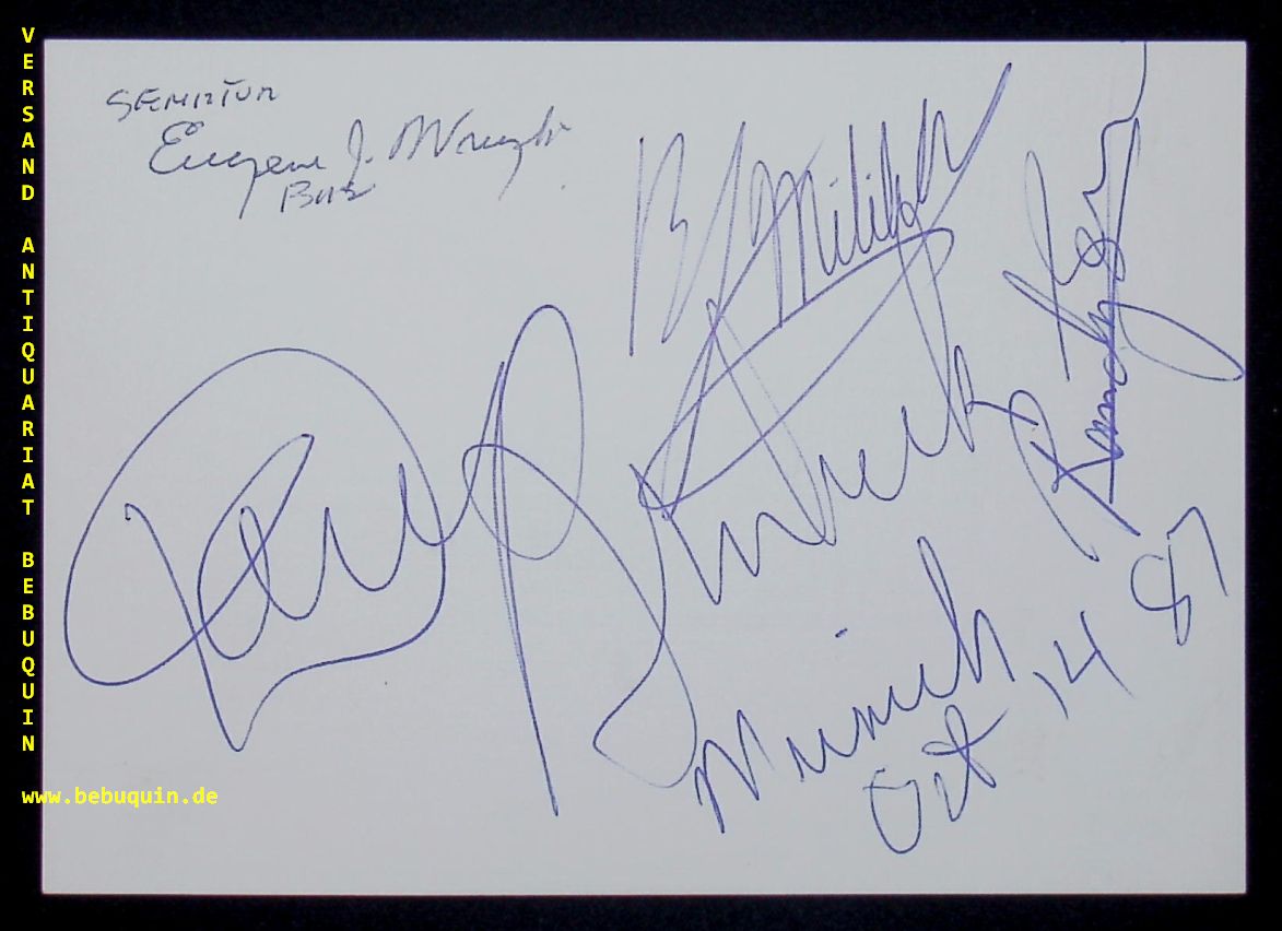 JAZZ.– BRUBECK, Dave (Pianist) + MILITELLO, Robert (Klarinettist) + WRIGHT, Eugene (Bassist) + JONES, Randy (Schlagzeuger): eigenhändig von allen signierte und datierte Autogrammkarte. München (Philharmonie), 3.12.2000. 10,5 x 14,5 cm. große Karteikarte. David Warren „Dave“ Brubeck (* 6. Dezember 1920 in Concord, Kalifornien; † 5. Dezember 2012 in Norwalk, Connecticut) war ein US-amerikanischer Jazzpianist, Komponist und Bandleader. Er leitete mit seinem Quartett eine der langlebigsten und erfolgreichsten Combos des Modern Jazz und eroberte dem Jazz mit der intellektuellen Mittelschicht ein neues Publikum. Robert Philip „Bobby“ Militello (* 25. März 1950 in Buffalo, New York) ist ein US-amerikanischer Jazz-Musiker (Altsaxophon, Tenorsaxophon, Klarinette und Flöte). „The Senator“ Eugene Joseph Wright (* 29. Mai 1923 in Chicago) ist ein US-amerikanischer Jazz-Kontrabassist. Bekannt wurde er als Mitglied des Dave Brubeck Quartet, besonders durch das bekannteste Album der Gruppe Time Out (1959), mit dem Pianisten Brubeck, dem Schlagzeuger Joe Morello und dem Saxophonisten Paul Desmond.Randall Hodges Jones (January 23, 1944 – June 13, 2016) was a British-born American jazz drummer. (Wikipedia)