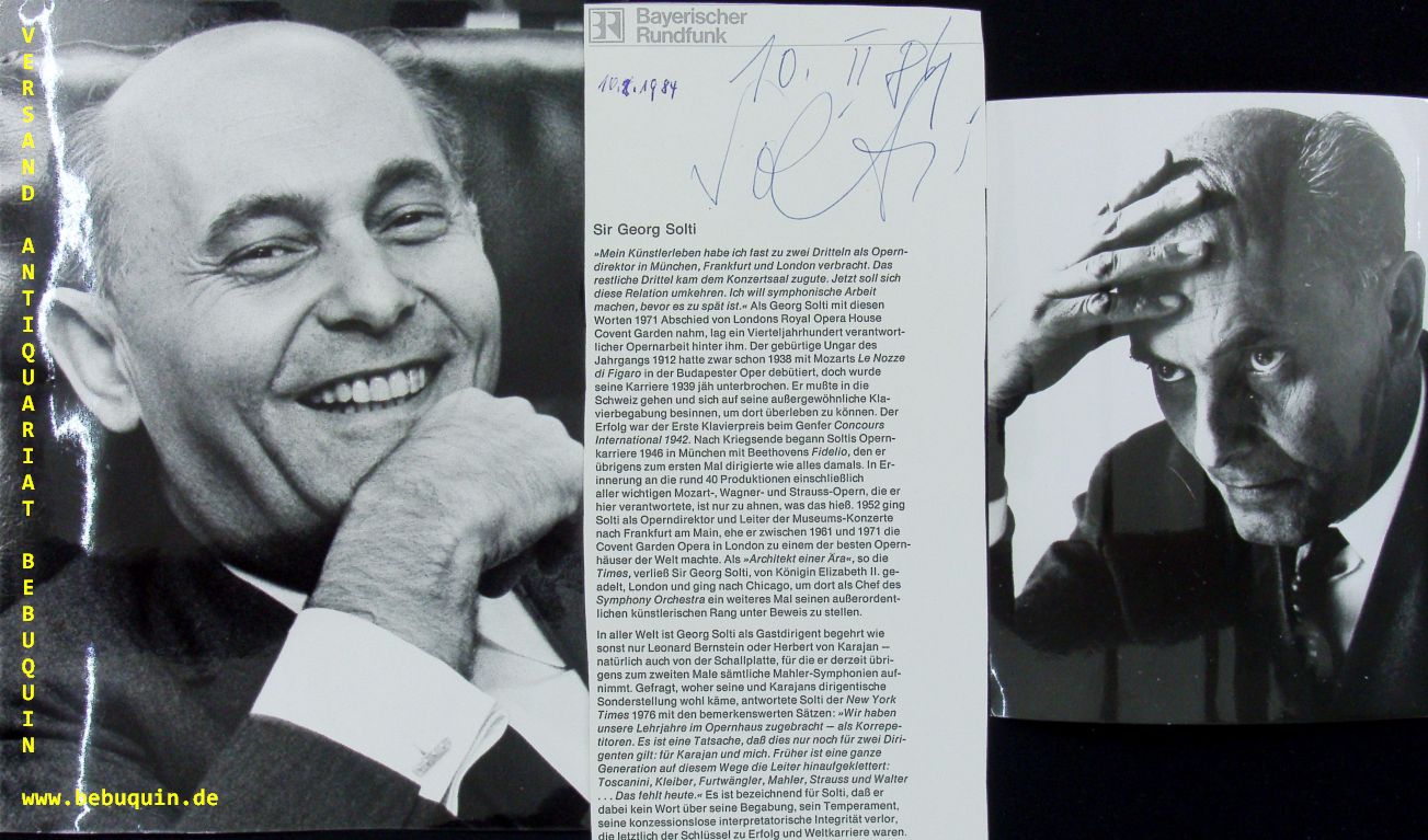 SOLTI, Sir Georg (Dirigent): eigenhändig signiertes und datiertes Programm. München, 10.2.1981. 24 x 11,5 cm. 1 Bl. + 2 Original Fotos von 1969. . Sir Georg Solti (* 21. Oktober 1912 in Budapest als György Stern; † 5. September 1997 in Antibes, Frankreich) war ein ungarisch-britischer Dirigent jüdischer Abstammung. (Wikipedia)