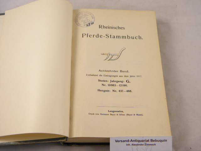 PFERDE.– RHEINISCHES PFERDE-STAMMBUCH.– 18. Bd. Enthaltend die Eintragungen aus dem Jahre 1917. Stuten: Jahrgang G. Nr. 10983 – 12190. Hengste: Nr. 437 – 468. Langensalza (Beyer), o.J. X, 621 S. OHLn. mit goldgeprägtem Rücken. kleines Papierrückenschild, Einband etwas berieben, sonst sehr gut erhalten.