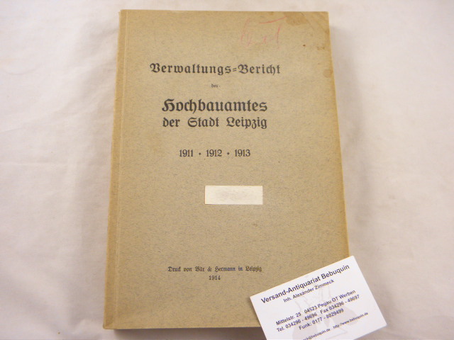LEIPZIG.– VERWALTUNGS-BERICHT DES HOCHBAUAMTES DER STADT LEIPZIG. 1911 – 1912 – 1913. Leipzig (Bar & Hermann), 1914. 4°. 99 S. mit 175 (3 farbigen) teils doppelblattgroßen Tafeln. OKart. Einband leicht angeschmutzt mit kleinem Aufkleber, sonst sehr fein erhalten.