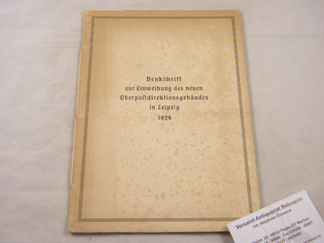 LEIPZIG.– DENKSCHRIFT ZUR EINWEIHUNG DES NEUEN OBERPOSTDIREKTIONSGEBÄUDES IN LEIPZIG 1926.– Leipzig, 1926. Gr. 8°. 40 S. mit zahlr. zumeist fotografischen Abb. und 8 Anlagen sowie einigen Beilagen. OKart. Einband etwas stockig, sonst gut.