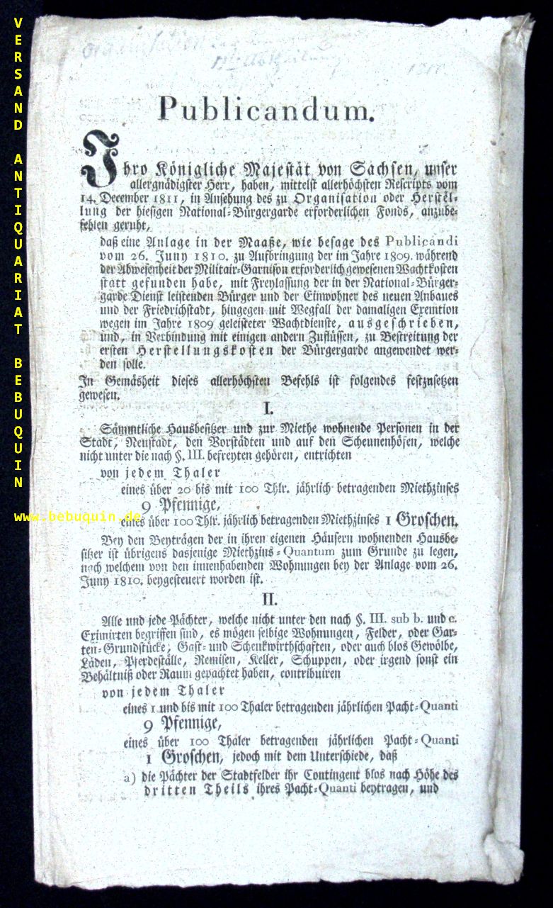 EDIKTE.– FRIEDRICH AUGUST I. (1. KÖNIG VON SACHSEN): Hausbesitzer Publicandum. “… Sämmtliche Hausbesitzer und zur Miethe wohnende Personen in der Stadt, Neustadt, den Vorstädten und auf den Scheunenhöfen, entrichten von jedem Thaler 9 Pfennige ….″ Dresden, 2. Juni 1812. 34 x 20 cm. 4seitiges Edikt auf Hadernbütten Doppelbogen unterzeichnet von Johann Gottlieb Näke. gutes Ex. Friedrich August I. Joseph Maria Anton Johann Nepomuk Aloys Xaver „der Gerechte“ (* 23. Dezember 1750 in Dresden; † 5. Mai 1827 ebenda) war seit 1763 als Friedrich August III. Kurfürst und von 1806 bis zu seinem Tod erster König von Sachsen. Er wurde 1791 zum König von Polen gewählt, amtierte jedoch nur von 1807 bis 1815 als Herzog von Warschau.
