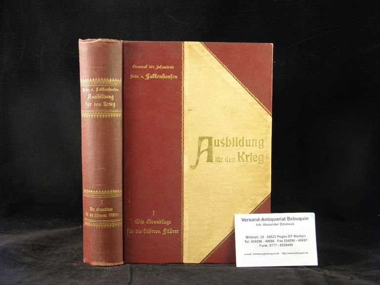 FALKENHAUSEN, Alexander Freiherr von: Ausbildung für den Krieg. 1. Teil: Die Grundlage für die höheren Führer. Berlin (Mittler), 1902. Gr. 8°. VIII, 311 S. + 2 Übersichtskarten und 22 Sektionen der Generalstabskarte im Maßstabe 1:100000. OHLn mit Goldprägung. kaum gebräunt. EA.