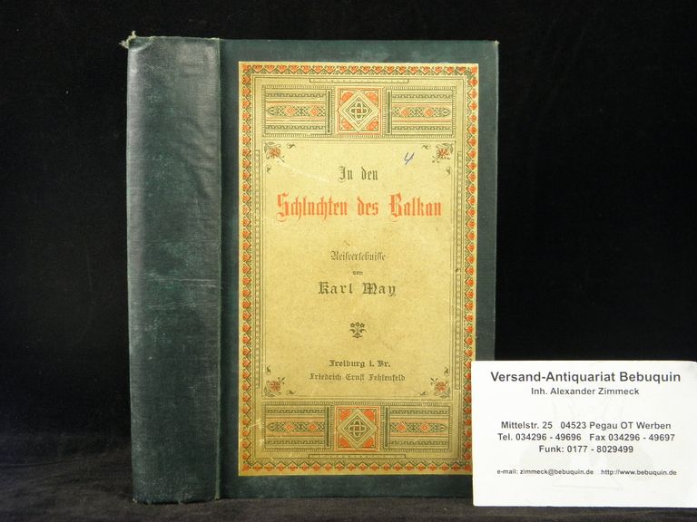 MAY, Karl: In den Schluchten des Balkan. Reiseerlebnisse. 31.– 35. Tsd. Freiburg (Fehsenfeld), (1901). 607 (1) S. Ln der Zeit mit aufgesetzter OBr. Einband unter Verwendung des original Broschurdeckels. Jendrewski 158 = Gesammelte Reiseertzählungen, Bd. IV. Frühe Buch-Ausgabe mit der seltenen Einbandvariante Plaul 232.6.