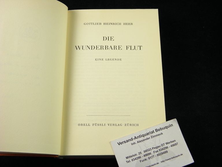 HEER, Gottlieb Heinrich: Die wunderbare Flut. Eine Legende. Zürich (Orell Füssli), 1945. 203 (5) S. OLn mit goldgeprägter Deckelvignette. EA mit einer 5zeiligen handschriftlichen voll signierten und datierten Verfasserwidmung auf Vortitel. Kosch DD 876, 13.