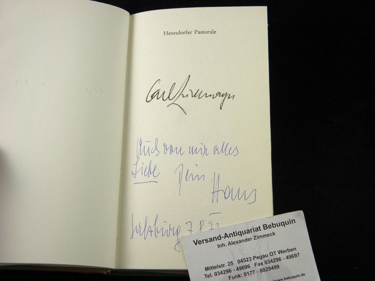ZUCKMAYER, Carl: Henndorfer Pastorale. Salzburg (Residenz), 1972. 116 S. mit Zeichnungen von Clemens Holzmeister. OLn. mit OUmschl. weitere Widmung auf Vortitel. EA mit der eigenhändigen Signatur des Dichters auf Vortitel. WG² 73.