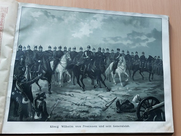 MAY.– DITTRICH, Max: Der Deutsch-Französische Krieg 1870 und 1871. Dresden (Münchmeyer), 1889. 44 x 56 cm. 1 Bl., 86 S. mit 26 (davon 24 farb.) lithogr. Tafeln in Öldruck von Max Henze sowie zahlr. Textholzst. Oln. mit Blind- und Schwarzprägung in OSchuber. fliegende Vorsätze lose und lädiert, Schuber stärker lädiert, kleiner Braunfleck am unteren Schnitt, sonst von feinster farbstarker Erhaltung mit nahezu jungfräulichen Farbtafeln. EA mit allen Tafeln. Die Tafeln ganz im Stile eines Volksbuches in kräftigen Farben gehalten, zeigen die wichtigsten Schlachten des Krieges meist mit Hintergrundansichten: Erstürmung des Gaisberges./ Reiterangriff bei Reichshofen. / Angriff d. franz. Cürassire bei Morsbrunn./ Erstürmung der Spicherer Höhen./ Reitergefecht bei Buzancy./ Waldkampf bei Sedan./ Reiterangriff bei Sedan./ Schlacht bei Artenay. / Erstürmung von Orleans./ Gefecht bei Raon l’ Etape./ Erstürmung von Chateaudun./ Erstürmung von Le Bourget./ Beschiessung von Strassburg./ Schlacht bei Champigny./ Schlacht bei Monbeliard./ Schlacht bei St. Quentin./ Uebergang Bourbaki’s in die Schweiz./ Truppeneinzug in Dresden am 11. Juli 1871 (ganzseitiger Holzstich)./ Das Nationaldenkmal auf dem Niederwald. (s/w) / Einzug in Berlin (s/w)./ König Wilhelm von Preussen u. sein Generalstab (s/w)./ Schlacht bei Beaumont./ Reitergefecht bei Mars la Tour./ König Wilhelm bei Rezonville./ Sturm auf St. Privat./ Uebergabe von Metz./ Erstürmung von Dijon./ Einzug in Paris am 1. März 1871. Der Freund und Knastkumpan Karl Mays, Julius Eduard Maximilian Dittrich (10.6.1844 – 10.5.1917) war Hauslehrer, Journalist und ab 1870 Redakteur verschiedener Zeitungen in Dresden. Da der frühere kaufmännische Angestellte vom 13.7.1866 – 13.1.1868 wegen Betrugs und Unterschlagung in Schloss Osterstein inhaftiert war, kannten sich May und Dittrich vermutlich bereits aus dieser Zeit. (May sass ab 14.6.1865 ebendort ein.) Da Dittrich zur selben Zeit wie May in Schloss Osterstein war, kannten sie sich vermutlich bereits aus dieser Zeit. Dittrich erklärte dazu am 25. November 1908: „Es ist richtig, daß ich May das erste Mal in Schloß Osterstein in Zwickau gesehen habe, und zwar im Jahre 1866. Gesprochen habe ich ihn damals aber nicht.″