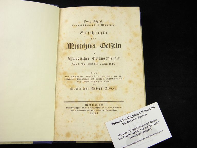 DREISSIGJÄHRIGER KRIEG.– SIGL, Franz: Geschichte der Münchner Geißeln in schwedischer Gefangenschaft vom 7. Juni 1632 bis 3. April 1635. Aus einer gleichzeitigen Handschrift herausgegeben, und mit erläuternden Anmerkungen und Zusätzen, größtentheils aus archivalischen Nachrichten, begleitet von Maximilian Joseph Stöger. München (Giel), 1836. IV S., 1 Bl., 220 S. neues HLn. mit goldgeprägtem Rückenetikett. innen durchgängig stockfleckig. EA.