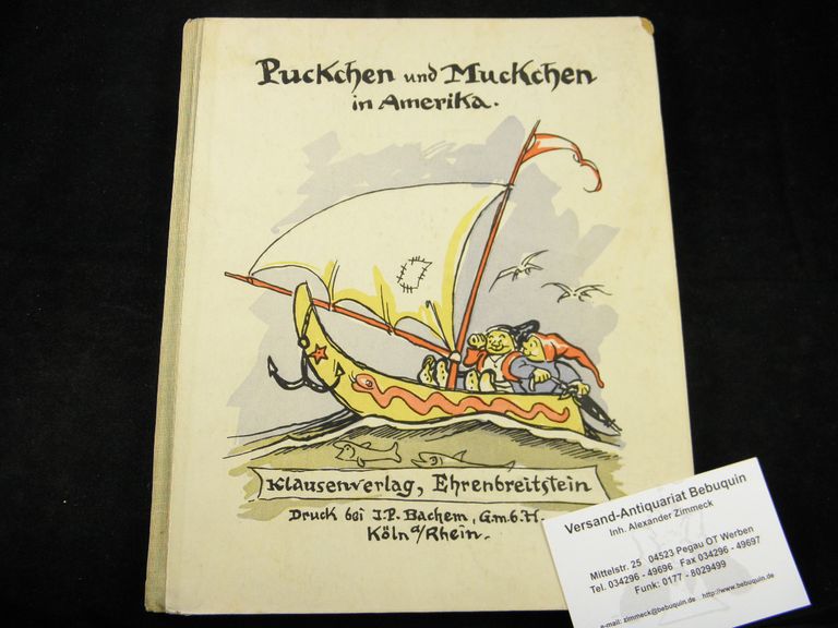 STORCH, Carl: Zwergen – Reise nach Amerika beschrieben und mit Bildern illustriert von Meister Häcksel und Klecksel. Ehrenbreitstein (Klausen), 1926. Gr. 8°. 40 S. mit zahlreichen farbigen Illustrationen von Frans Franssen und Carl Storch. farb. ill. OHLn. eine Ecke leicht berieben, hinterer fliegender Vorsatz mit Eckabriss, sonst tadellos erhalten. = Puckchen und Muckchen, 2. Bändchen. EA. Puckchen und Muckchen sind zwei von Carl Storch geschaffene Zwerge, die die Welt erkunden. Charakteristisch ist ihre Neugier auf das Unbekannte und dass sie häufig mit viel Glück den Gefahren des Reisens entrinnen können. Die illustrierten Kindergeschichten in Reimform erinnern an Max und Moritz von Wilhelm Busch. Carl Storch hat die Figuren in den ersten beiden Bänden entwickelt, für die er neben der Illustration selbst die Texte geschrieben hat (Puckchen und Muckchen, Zwergenreise ins Erdinnere, als Buch erschienen 1924, und Puckchen und Muckchen in Amerika, als Buch erschienen 1926). (Wikipedia)