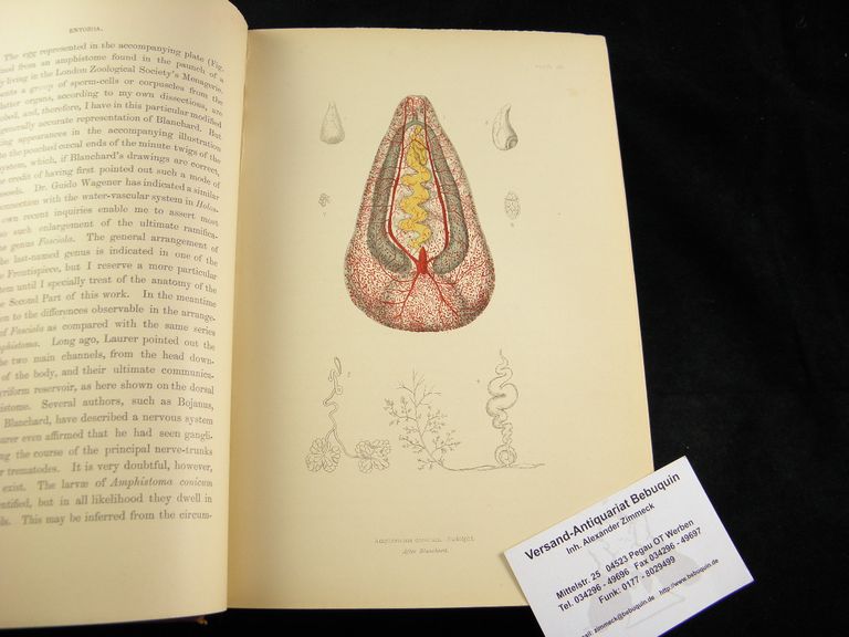 PARASITOLOGIE.– COBBOLD, T. Spencer: Entozoa. An Introduction to the Study of Helminthology, with Reference, More Particularly, to the Internal Parasites of Man. + Entozoa Being a Supplement to the Study of Helminthology. 2 Bände in einem Band. London (Groombridge), 1864 – 1869 Gr. 8°. XXVI, 480 S. + VIII, 124 S. mit 84 Textabb. + 21 lithographische Farbtafeln von Fawcett of Driffield. OLn. Einband stärker geblichen, oberes Kap. angeplatzt, Gelenke etwas gelockert, insgesamt von guter Erhaltung. EA des gesuchten seltenen Standardwerks zur Parasitologie. Cobbold forschte über parasitische Würmer und praktizierte auf diesem Gebiet auch als beratender Arzt in London. 1868 bis 1873 war er Swiney Lecturer für Geologie am British Museum und danach Professor für Botanik am Royal Veterinary College, was später in eine eigens für ihn geschaffene Professur für Helminthologie umgewandelt wurde. Sein Spezialgebiet waren parasitische Würmer in Mensch und Tier. (Wikipedia)