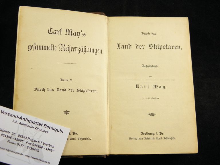 MAY, Karl: Durch das Land der Skipetaren. Reiseerlebnisse. 21.-25. Tsd. Freiburg (Fehsenfeld), (1900). 597 (3) S. mit marmorierten Vorsatzpapieren. OHLdr. mit goldgeprägtem Rücken. Kanten leicht berieben, feines Ex. = Gesammelte Reiseerzählungen, Bd. V. Plaul 237.4.