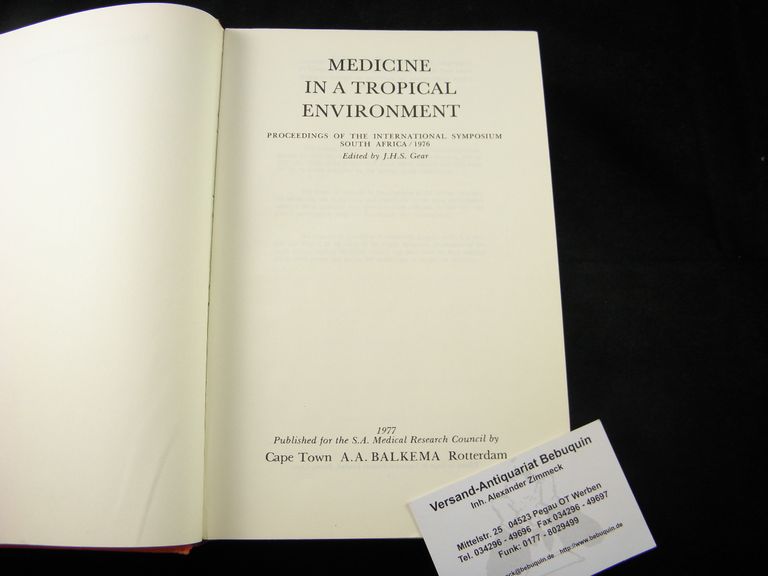 PARASITOLOGIE.– GEAR, J.H.S.: (Hrsg.) Medicine in a tropical environment. Proceedings of the International Symposium South Afrika 1976. Kapstadt, Rotterdam (Balkema), 1977. Gr. 8°. XIII, 817 S. mit zahlr. Abb. OLn mit goldgeprägter Deckelvignette. feines Ex. EA.