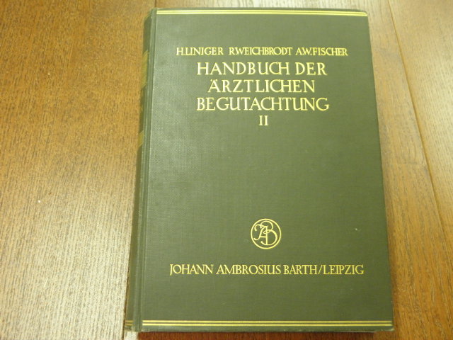 MEDIZIN.– LINIGER, H. + WEICHBRODT, R. + FISCHER, A.W.: (Hrsg.) Handbuch der ärztlichen Begutachtung. Bd. II. (von 2). Leipzig (Barth), 1931. Gr. 8°. XII, 678 (2) S. mit 3 Abb. OLn mit Goldprägung. Ordnungsgemäß aus den Beständen der Volkspolizei ausgesondertes Bibliotheksexemplar (Rückenschild, Stempel). EA.
