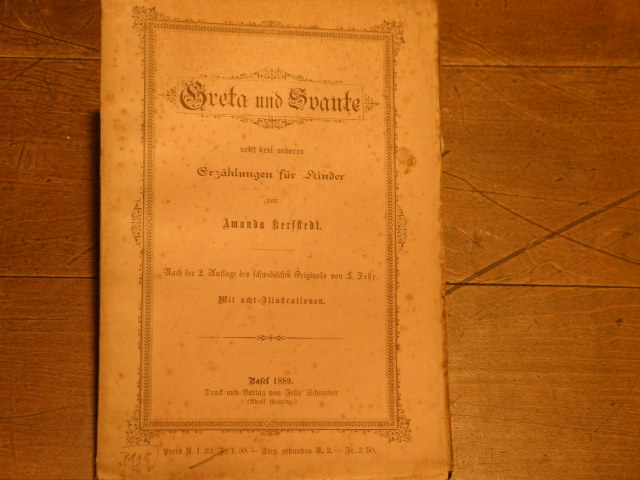 KERFSTEDT, Amanda: Greta und Svante. Nebst drei anderen Erzählungen für Kinder. D.v. L. Fehr. Basel (Schneider), 1889. IV, 164 S. mit 8 Illustrationen. ill. OBr. Einband leicht angeschmutzt, unaufgeschnitten. dt. EA. (Pataky 421)