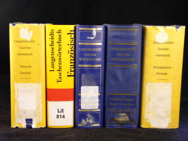 DÄNISCH / SCHWEDISCH / PORTUGIESISCH / FRANZÖSISCH / SPANISCH.– 5 LANGESCHEIDTS TASCHENWÖRTERBÜCHER.– Dänisch, schwedisch, portugiesich, französisch, spanisch. Jeweils 2 Teile in 1 Bd. 5 Bände. Berlin (Langenscheidt), ca 1980. kl. 8°. zusammen ca 5000 S. blaues OPlast teilweise mit OUmschl. Ordnungsgemäß aus Bundeswehrbeständen ausgesondertes Bibliotheksexemplar (Stempel und Rückenschild).