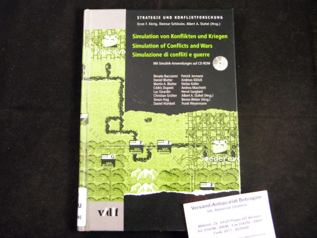 | KÖNIG / SCHÖSSLER / STAHEL: Strategie und Konfliktforschung. Simulation von Konflikten und Kriegen. Anwendungen mit Simulink. Deutsch / Englisch. Zürich (vdf); 2002. Gr. 8°. 112 S. mit CD inliegend. ill. OPb. Ordnungsgemäß aus Bundeswehrbeständen ausgesondertes Bibliotheksexemplar (Rückenschild, Stempel). EA.