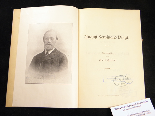 MEDIZIN.– EULER, Carl: August Ferdinand Voigt. Ein Lebensbild. Berlin (Gabl), 1898. 28 S. mit Portraittafel und 2 Grabsteintafeln. OKart. Ordnungsgemäß aus Bundeswehrbeständen ausgesondertes Bibliotheksexemplar (Stempel). sehr seltene EA, die derzeit nur in einer Bibliothek in Chicago nachweisbar ist.
