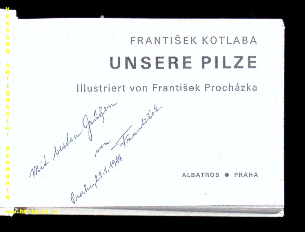 PILZE.– KOTLABA, František: Unsere Pilze. Prag (Albatros), . Quer 12° 359 S. zahlr. farb. Bildtafeln von Frantisek Prochaska. farb. ill. OPb. gutes Ex. dt. EA mit einer eigenhändigen signierten und datierten Widmung von Frantisek Prochaska auf Titelseite.