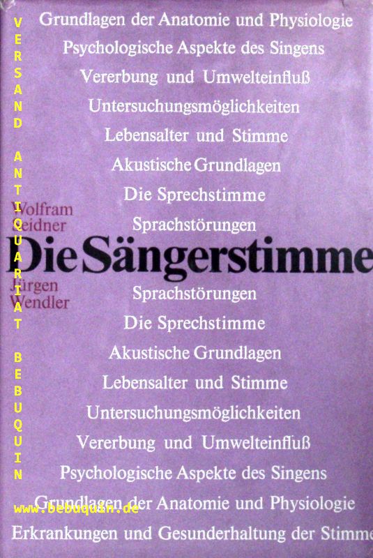 SEIDNER, Wolfram + WENDLER, Jürgen: Die Sängerstimme. Phoniatr. Grundlagen für d. Gesangunterricht. Berlin (Henschel), 1978. 215 S mit 65 Ill. OLn mit OUmschl. gutes Ex. EA.