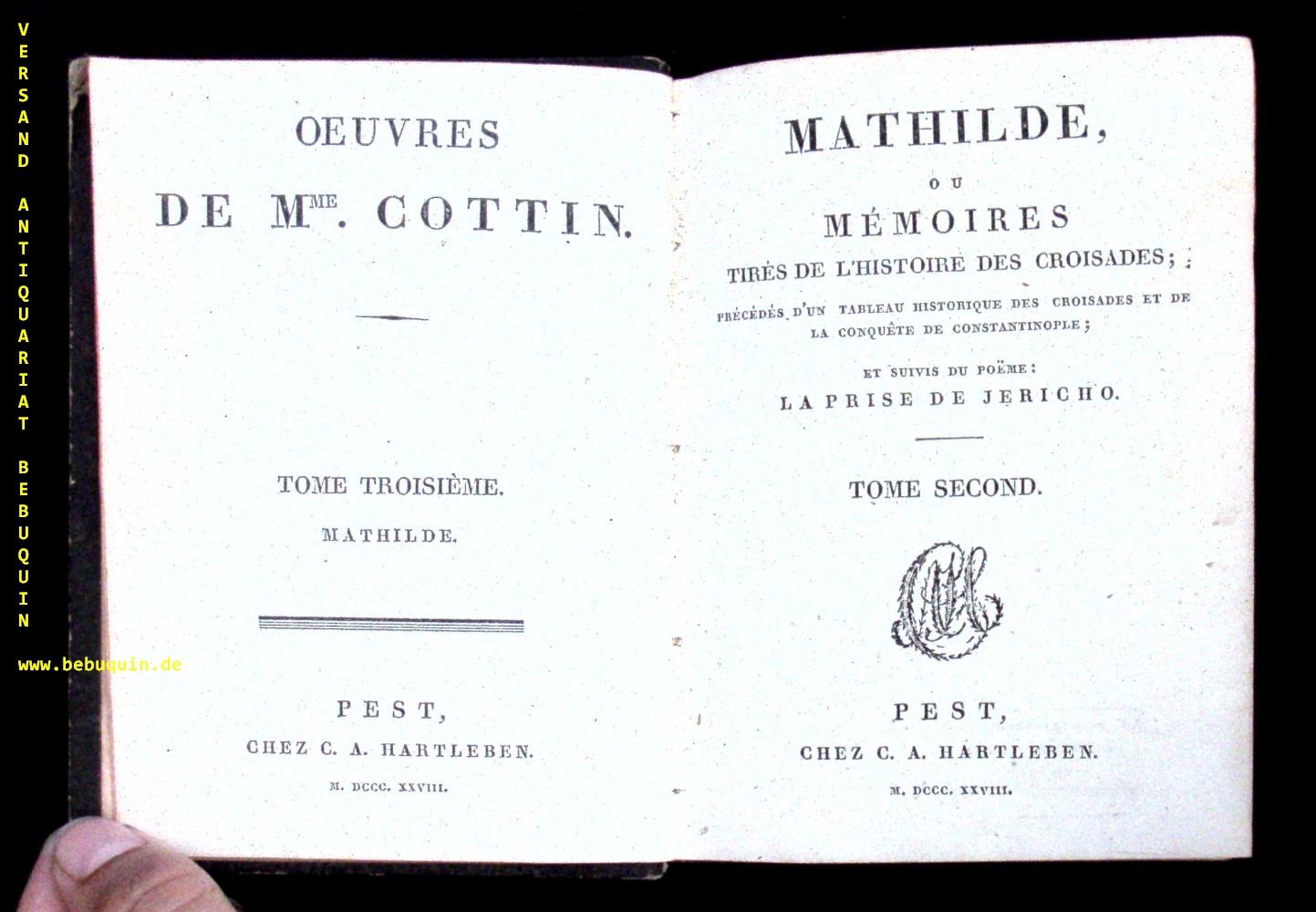 COTTIN, Sophie: Oeuvres de Mme. Cottin. Tome 1 – 8. 8 in 4 Bänden. Pest (Hartleben), 1823 – 1828. 12°. ca 1600 S. OPb mit goldgeprägten Lederschildern. Kanten etwas berieben, insgesamt gut erhalten. dt. EA dieser Werkausgabe.