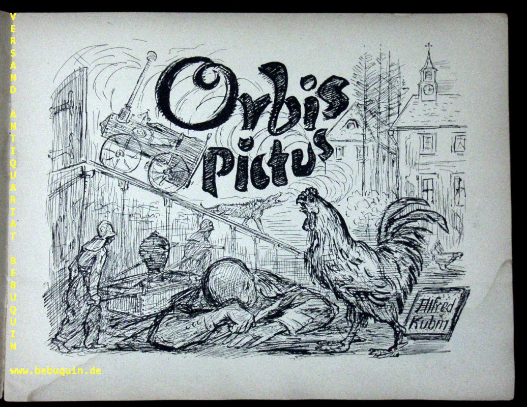 KUBIN, ORBIS PICTUS.– KUBIN, Alfred.: Ausstellung im Graphischen Kabinett der Galerie Henning. Halle, Februar – März 1948. Quer 4°. 16 Bl. mit einer Vorbemerkung Kubins, einer Würdigung durch Richard Horn sowie diverse Zeichnungen auf 26 S. ill. OKart. Rand gebräunt, anfangs mit stärkerem Wasserrrand. EA.