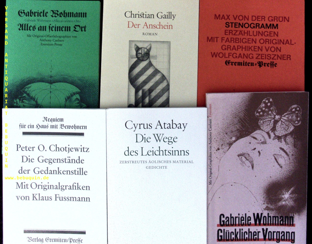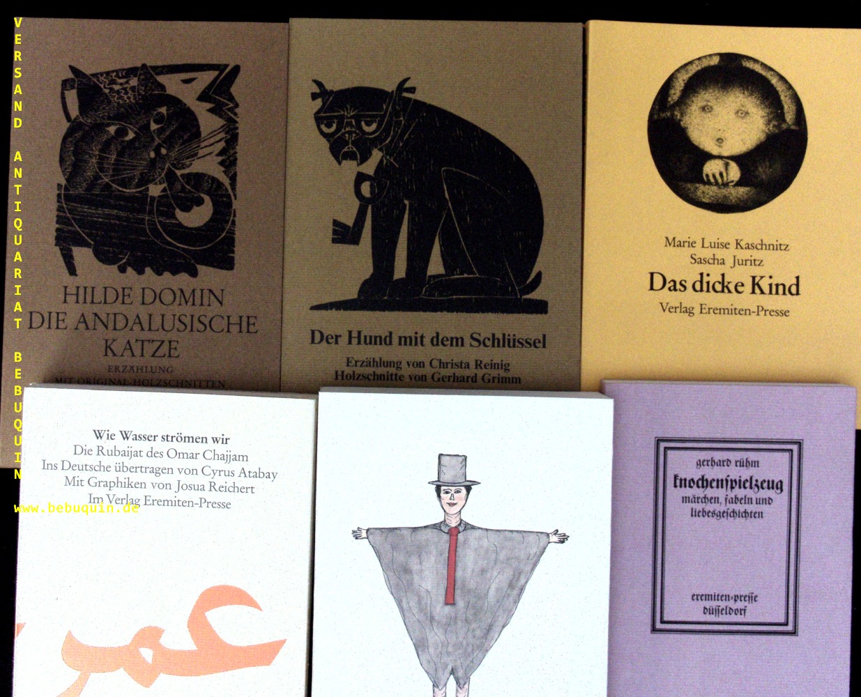 EREMITEN-PRESSE.– KONVOLUT: 32 Bände in Erstausgabe. Autoren: Reinig, Meckel, Chotjewitz, Atabay, Max von der Grün etc. Düsseldorf (Eremiten-Presse), 1975 – 1999. verschiedene. jeweils ca 50 S. mit zahlr. teils farb. Illustrationenn teils in Originaldrucken. ill. OKart. und OPb. tadellos. schöne Reihe der bibliophilen Ausgabe zum Sonderpreis. Siehe Fotos.