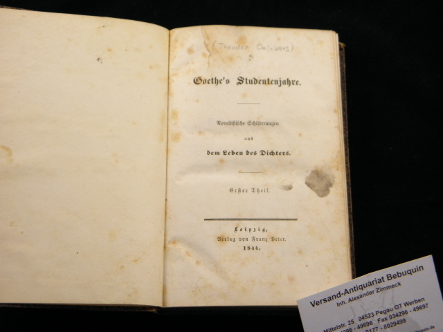 OELCKERS, Theodor: Goethe’s Studentenjahre. Novellistische Schilderungen. 2. Theile in 1 Bd. Leipzig (Peter), 1844. 242, 226 S. Pb der Zeit. Kanten leicht berieben, einige Wasserränder am Blattrand, teils braunfleckig. seltene EA.