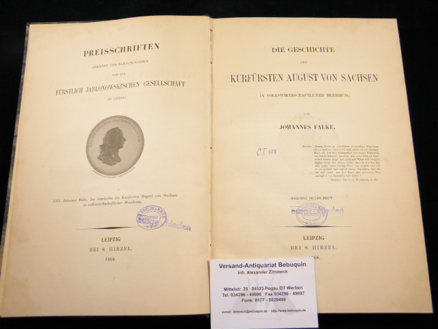 SACHSEN.– FALKE, Johannes: Die Geschichte des Kurfürsten August von Sachsen in volkswirtschaftlicher Beziehung. Gekrönte Preisschrift. Leipzig (Hirzel), 1868. 4°. 352 S. HLn der Zeit mit goldgeprägtem Rücken. Bibliotheksex. = Preisschriften, Bd. XIII. sehr seltene EA. Dies Original gibts nur bei mir.
