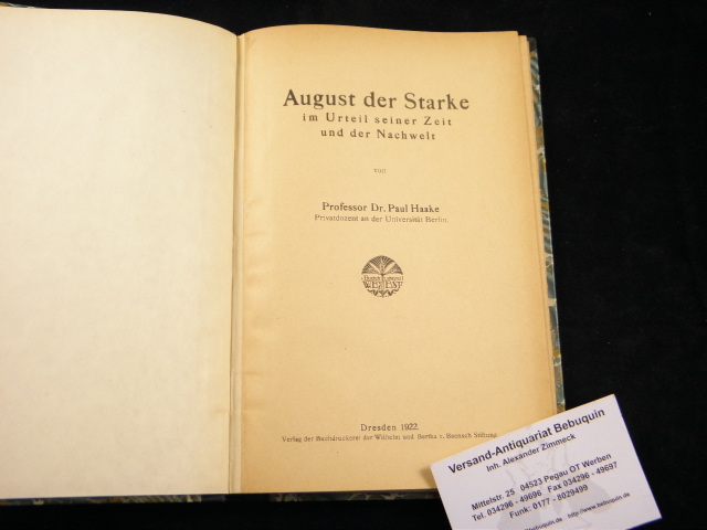SACHSEN.– HAAKE, Paul: August der Starke im Urteil seiner Zeit und der Nachwelt. Dresden (Baensch), 1922. VI, 125 S. HLn der Zeit. einige Bleistiftunterstreichungen. EA.