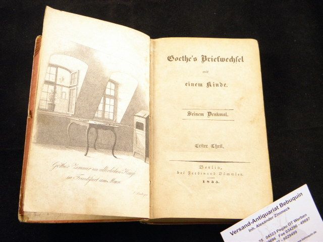 (ARNIM, Bettina von): (Anonym) Goethe’s Briefwechsel mit einem Kinde. Seinem Denkmal. Tagebuch. 3 Bände. Berlin (Dümmler), 1835. XII, 356, 324, 243 S. mit 3 gestochenen Frontispizen und 1 doppelblattgroßen Aquatintaradierung. HLdr. der Zeit mit goldgeprägtem Rücken. Kanten leicht berieben, Papier teils altersbedingt gebräunt, insgesamt gut erhalten. Sehr seltene EA des Erstlingswerkes und literarisches Monument der Verehrung Bettinens für Goethe. WG² 1 + 2.