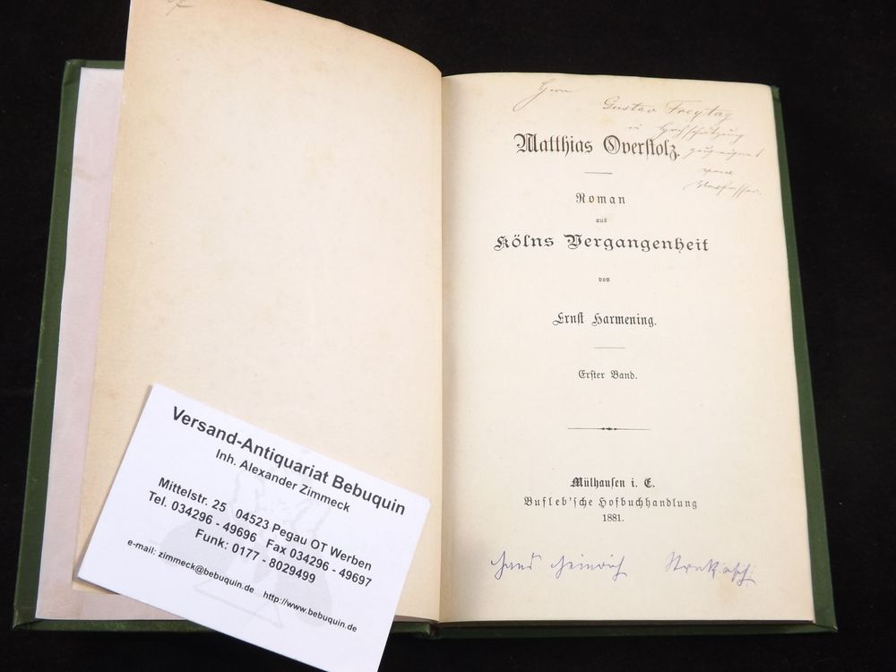 HARMENING, Ernst: Matthias Overstolz. Roman aus Kölns Vergangenheit. 2 Bände. Mülhausen (Bufleb´sche), 1881. VI, 188, 2 Bl.,191 S. OLn. mit reicher Gold- und Schwarzprägung. NaT. EA des Erstlingswerks des Juristen, Schriftstellers und Mitglieds des Deutschen Reichstags mit einer fünfzeiligen, eigenhändigen Verfasserwidmung für Gustav Freytag.