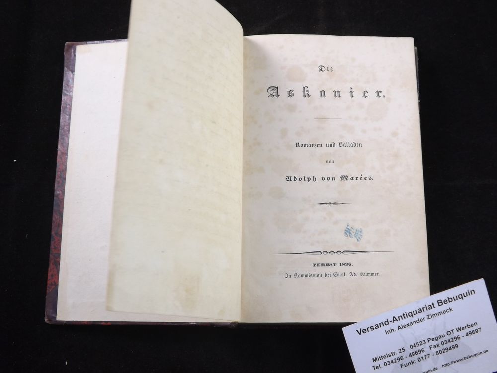 MARÉES, Adolph von: Die Askanier. Romanzen und Balladen. Zerbst (Kummer), 1836. 140 (1) S. HLdr. der Zeit mit goldgeprägtem Rücken. teils leicht stockfleckig. seltene EA des Erstlings des Vaters von Hans von Marees. Mit angebunden: Ders. Don Juan. A. d. Engl. des Lord Byron. Im Versmaaße des Originals übersetzt von A. von Marees. Bädeker, 1839. 4 Bl., 258 S. Die beiden ersten Veröffentlichungen in einem Band mit einem 20-zeiligen, eigenhändigen Gedicht von Adolpf von Marees auf dem Vorsatz, signiert und datiert.