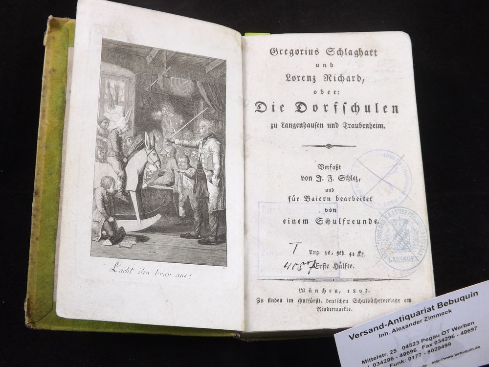 SCHLEZ, Johann Ferdinand: Gregorius Schlaghart und Lorenz Richard, oder: Die Dorfschulen zu Langenhausen und Traubenheim. Für Baiern bearbeitet von einem Schulfreunde. 2 Teile in 1 Bd. München (Schulbücher), 1803. kl. 8°. 5 Bl., 404 S. mit 1 gestochenen Frontispiz. Pb. der Zeit mit goldgeprägtem Rückenschild. fliegender Vorsatz fehlt, Titel mit zwei Stempeln, insgesamt recht gut erhalten. wohl die 2. Aufl. der pädagogischen Schrift des hessischen Pfarrers und Dortschullehrers Schlez (1759 – 1839). Seebaß 1762.