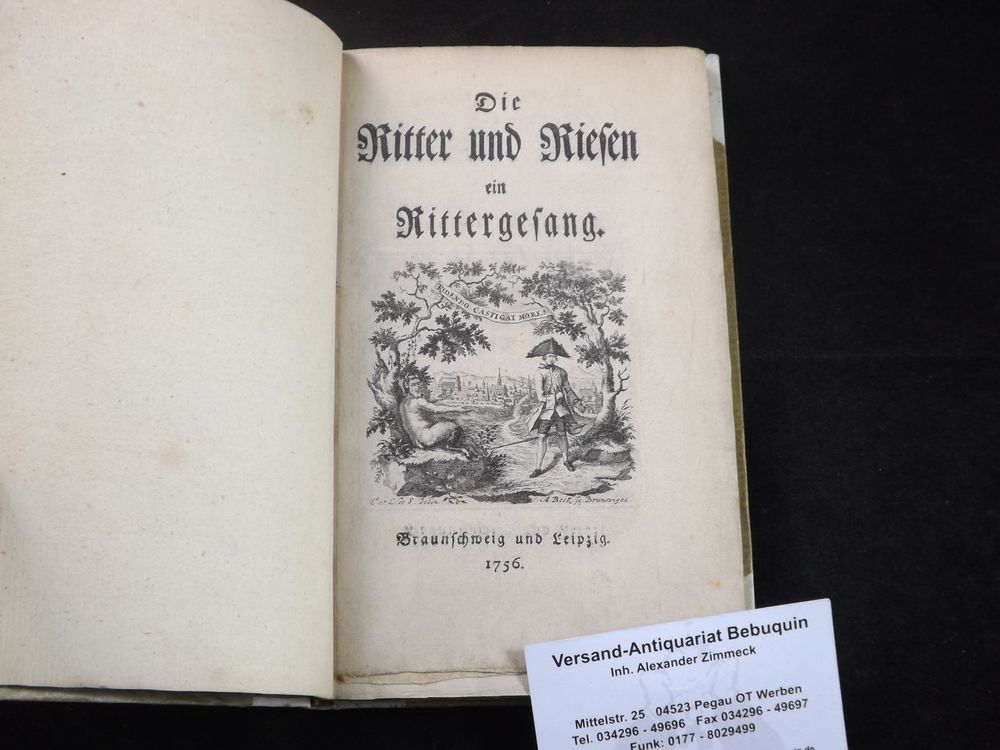 SCHRADER, Paul August: Die Ritter und Riesen, ein Rittergesang. Braunschweig, 1756. 10 Bl., 148 S. mit 5 Kupferstichvignetten von A. A. Beck, davon 4 nach J. A. Tischbein, und 1 Holzstichvignette. späterer HPrgt. mit goldgeprägtem Rückenschild. Blattränder unbeschnitten, sehr schönes Ex. seltene EA des Erstlingswerks dieses komischen Heldenepos über das Studentenwesen der Universität Helmstedt. Hayn / Gotendorf VI, 479.