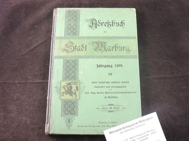 MARBURG.– ADRESSBUCH DER STADT MARBURG Jahrgang 1899.– Marburg (Johann August Koch), 1899. 104 S. + 44 S. geschäftliche Anzeigen. ill. OHLn. gutes Ex seltenes Adressbuch.