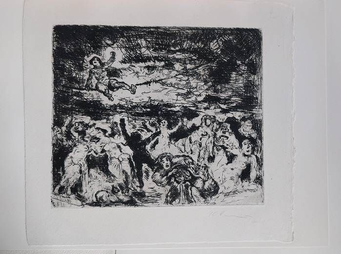 DANNEMANN, Karl: Belsazer. Des Propheten Daniel fünftes Kapitel. Berlin (Alf Häger), 1924. Fol. 5 Bl. mit farb. Abb. + 10 einzeln mit Bleistift signierten Radierungen unter Passe Partout in illustrierter OPrgtMappe mit leinenkaschierten Innenflächen in OSchuber Schuber an einer Seite aufgeplatzt, sonst sehr feines Ex. Nr. 6 von 50 Ex. (Gesamtauflage 120). Museal. Bei dieser Vorzugsausgabe wurden der Text auf Tosa Japan und die Radierungen von Carl Sabo auf Kaiserlich Japan gedruckt. Die Bindearbeit sowie die Textabbildungen und die Vergoldung übernahm die Werkstatt Holzhey & Sohn in Leipzig. Karl Dannemann war Meisterschüler von Max Slevogt. In den 1920er Jahren realisierte er in Bremen einige seiner markantesten Werke. Er schuf die Fresken im Bacchuskeller des Bremer Ratskellers, das Gemälde Hindenburg-Bankett im Bremer Rathaus, sowie diverse Bühnenbilder, Porträts, Seestücke, Stillleben, Stadt- und Landschaftsbilder. In den 1930er und 1940er Jahren betätigte sich Dannemann als Schauspieler beim Film, wo er in insgesamt über 50 Produktionen mitwirkte, in Unterhaltungsfilmen gleichermaßen wie in nationalsozialistischen Propagandafilmen. Vom Kriegseinsatz war er als unabkömmlich befreit worden und stand auf der Gottbegnadeten-Liste. Dannemann schied 1945 im Alter von 49 Jahren freiwillig aus dem Leben, um sich der Gefangennahme durch sowjetische Truppen zu entziehen. (Wikipedia)