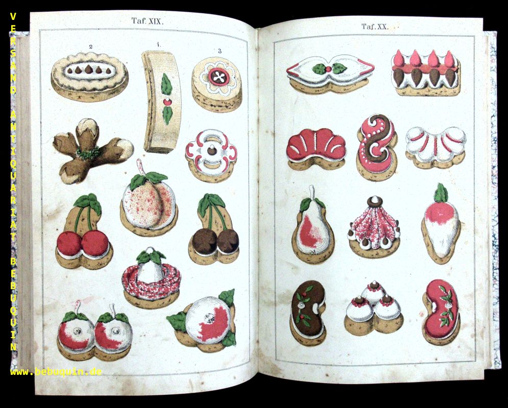 KOCHBÜCHER.– KRACKHART, Carl: Neues illustriertes Conditoreibuch. Ein praktisches Hand- und Nachschlagebuch für Conditorenm Fein-, Marcipan- und Pastetenbäcke, Zubereiter von Gefrorenem, Lebküchner, Chocolade- und Liqueurfabrikanten, Köche, Gasthofbesitzer, sowie für jede Hausfrau. Neue verb. u. verm. [2.] Aufl. Leipzig (Killinger), 1878. Gr. 8°. XV, 196 S., 58 (dav. 56 kolor.)farblithogr. Tafeln. HLn ca 1900. innen teils stärker finger- und stockfleckig. Standardwerk der Konditoreikunst. Der Autor betrieb eine Konditoreifachschule. Erstmals in Deutschland wurde das Medium der Chromolithographie für ein Buch der Gastronomie voll ausgenützt. Die Tafeln sind noch nicht sehr raffiniert wie in späteren Auflagen, gefallen aber durch ihren kindlichen Charme.