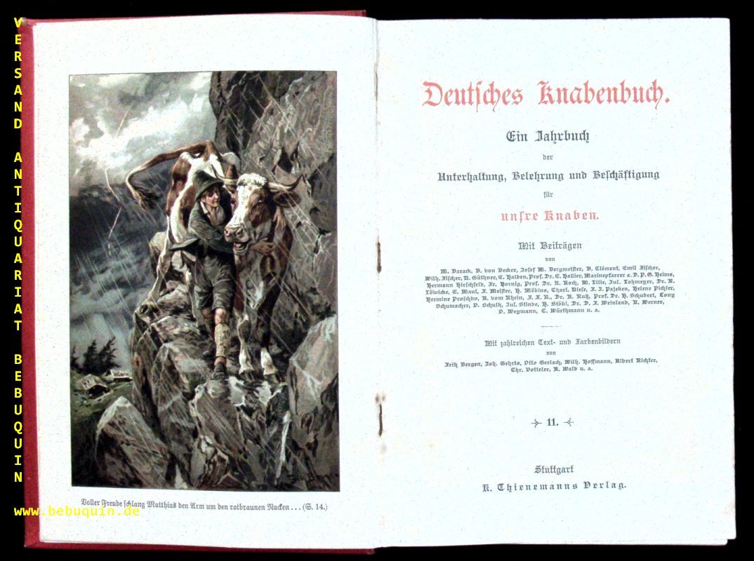 DEUTSCHES KNABENBUCH.– Bd. 11. Ein Jahrbuch der Unterhaltung, Belehrung und Beschäftigung für unsere Knaben. Stuttgart (Thienemann), (1899). Gr. 8°. 400 S., mit zahlr. teils farb. Text- und 6 Farbenbildern von Fritz Bergen, Joh. Gehrts, Gerlach, Wald, Chr. Votteler u.a. farb. ill. OLn. Rücken leicht berieben, Rückdeckel mit Fleck, erste Lage locker, sonst gut erhalten. Mit Texten von Barack, Bergmeister, Clement, Lohmeyer, Löwicke, Meister, Möbius, Niese, Pajeken, Pichler, Stökl, Wegmann u.a.
