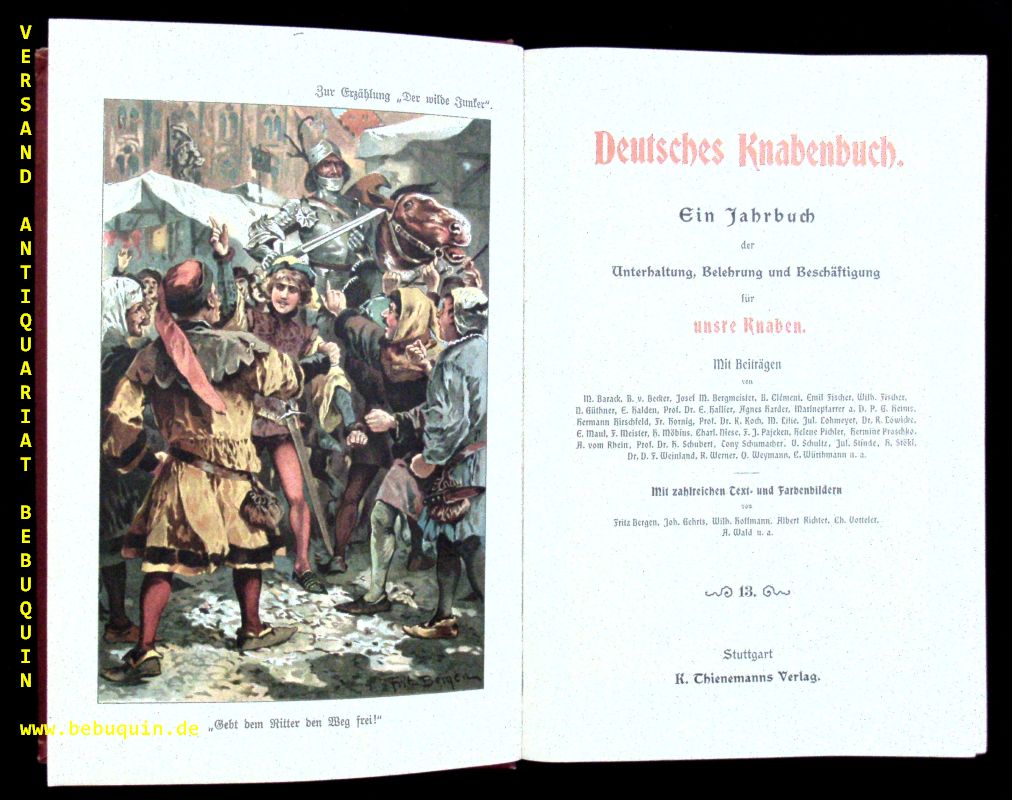 DEUTSCHES KNABENBUCH.– Bd. 13. Ein Jahrbuch der Unterhaltung, Belehrung und Beschäftigung für unsere Knaben. Stuttgart (Thienemann), (1901). Gr. 8°. 400 S. mit zahlr. teils farb. Text- und 6 Farbenbildern von Fritz Bergen, Joh. Gehrts, Richter, Wald, Chr. Votteler u.a. farb. ill. OLn. gut erhalten. Mit Texten von Barack, Bergmeister, Clement, Lohmeyer, Löwicke, Meister, Möbius, Niese, Pajeken, Pichler, Stökl, Weymann u.a.