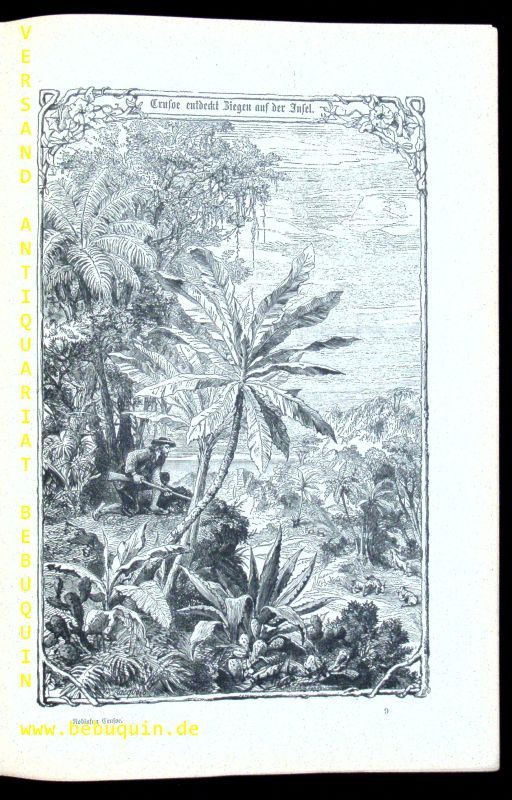 DEFOE, Daniel: Robinson Crusoe. 5. Aufl. Berlin (Warschauer), ca 1900. 4°. 1 Bl. 214 S. mit Titelvignette und 53 Illustrationen im Text von T. Macquoid. farb. ill. OLn. Kanten leicht berieben, vorderes Gelenk gelockert, Titelseite mit Knickspur, sonst gut erhalten. 1. Aufl. dieser Ausgabe.