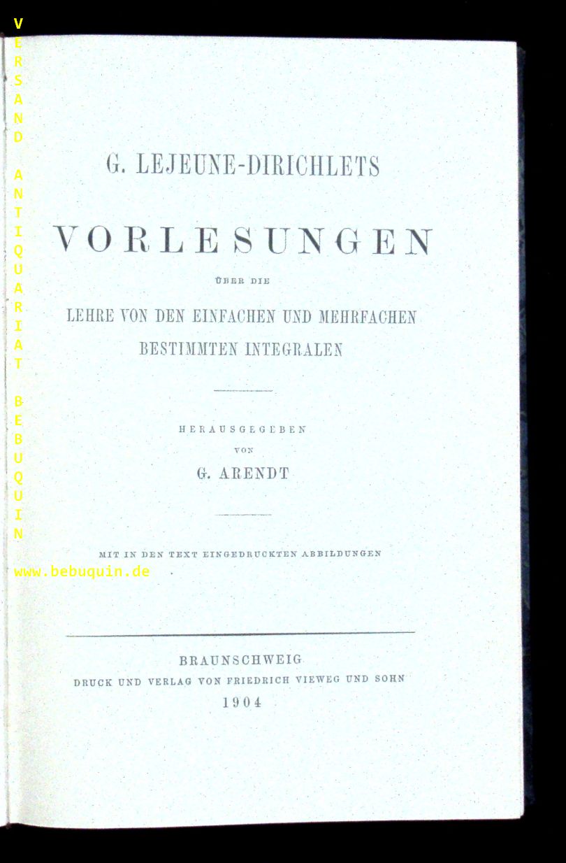 MATHEMATIK.– LEJEUNE-DIRICHLETS, G.: Vorlesungen über die Lehre von den einfachen und mehrfachen bestimmten Integralen. Hrsg. von G. Arendt. Braunschweig (Vieweg), 1904. Gr. 8°. 476 S. mit zahlr. Textabb. HLn der Zeit mit goldgeprägtem Rücken. gutes Ex. EA. Johann Peter Gustav Lejeune Dirichlet war ein deutscher Mathematiker. Er lehrte in Berlin und Göttingen und arbeitete hauptsächlich auf den Gebieten der Analysis und der Zahlentheorie. (Wikipedia.)
